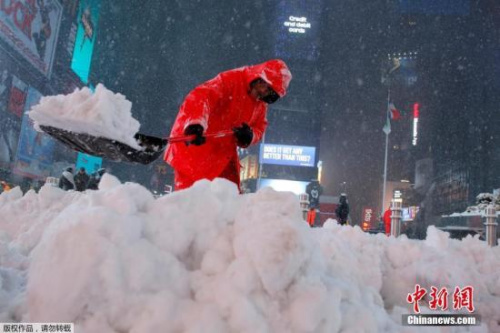 当地时间3月14日,美国纽约遭遇暴风雪天气,工人清理积雪。