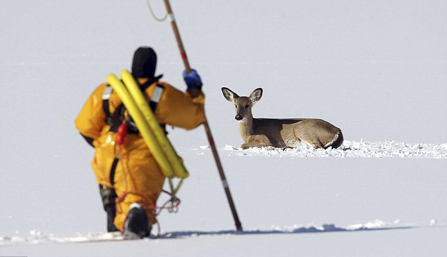 美国新泽西州一只小鹿被困在结冰湖面上长达24个小时,最终获救。
