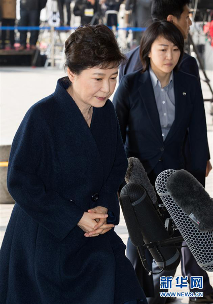 3月21日,在韩国首尔,朴槿惠抵达检察厅。当日,在韩国首尔,韩国前总统朴槿惠就亲信干政事件接受检方传唤。新华社发(李相浩摄)