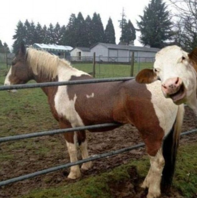 哈哈哈,哥们儿,卡在这儿了吧!快让我来张自拍!——一只牛对一只马的嘲笑