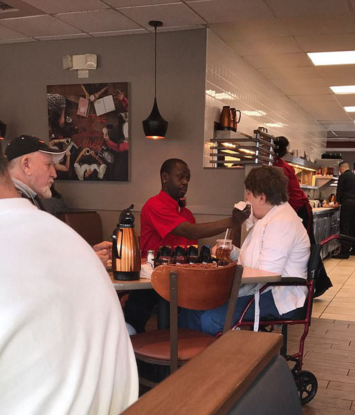 照片中,托马斯一边帮助行动不便的残疾顾客进食,一边轻轻地用餐巾帮她擦拭嘴角,十分细致耐心。这张照片是由餐厅内另一位顾客克希娅·多特森(Keshia Dotson)拍摄的,克希娅将这治愈人心的一幕发送给了托马斯所在连锁餐厅的“脸谱”官方帐号,引起了网友和媒体的广泛关注。