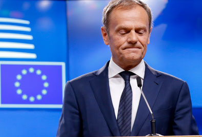 3月29日,在比利时布鲁塞尔欧盟总部,欧洲理事会主席图斯克就英国启动脱欧程序发表讲话。新华社记者叶平凡摄