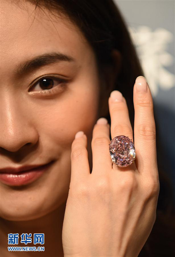 2017年4月4日59.60克拉粉红钻香港拍卖创纪录模特在香港苏富比艺术空间举行的媒体预展上展示“粉红之星”钻石(3月29日摄)。 4月4日,一枚名为“粉红之星”的59.60克拉椭圆形内部无暇艳彩粉红钻在香港苏富比瑰丽珠宝及翡翠首饰2017年春拍上以总额5亿5303.75万港元(约合7120万美元)拍出,创下世界钻石珠宝类拍卖最高价纪录。新华社记者刘昀摄新华社香港4月4日电(记者丁梓懿)