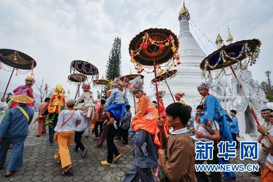 4月1日,在泰国北部夜丰颂城区,参加波桑龙出家仪式的“玉童子”们在亲属的陪伴下前往孔穆山寺(Wat Pratthat Doi Kongmu)巡礼。新华网记者李芒茫摄