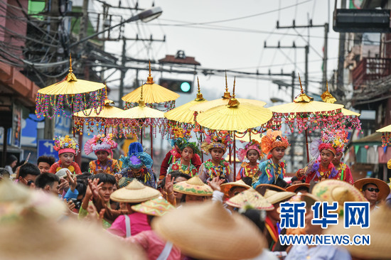 4月2日,在泰国北部夜丰颂城区,“玉童子”们在波桑龙出家仪式中参加一场盛装游行。新华网记者李芒茫摄