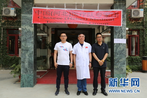 尼泊尔中资企业协会组织会员参加体检。图为协会会长袁志雄(右)、协会秘书长朱庆军(左)与医疗队队长袁好军(中)在体检现场合影。新华网记者周盛平摄