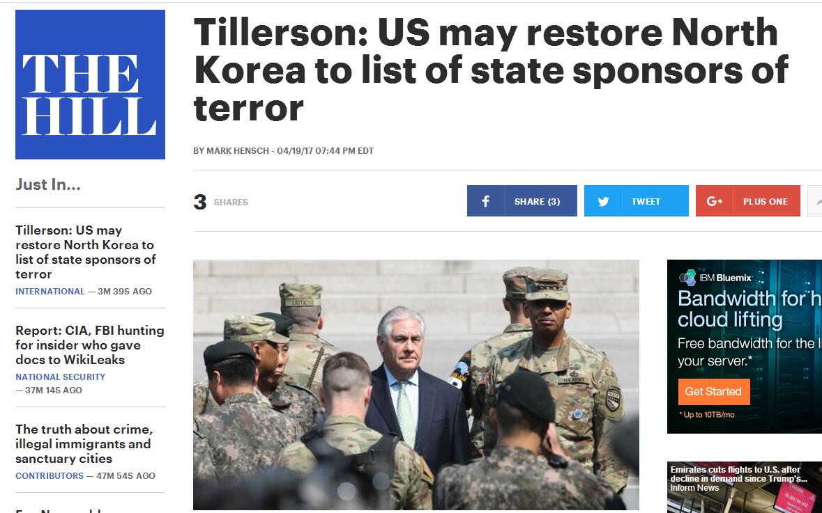 【环球网综合报道】美国《国会山报》4月19日报道,美国国务卿蒂勒森当日表示,华盛顿正研究是否应把朝鲜再次列入恐怖主义资助国名单。