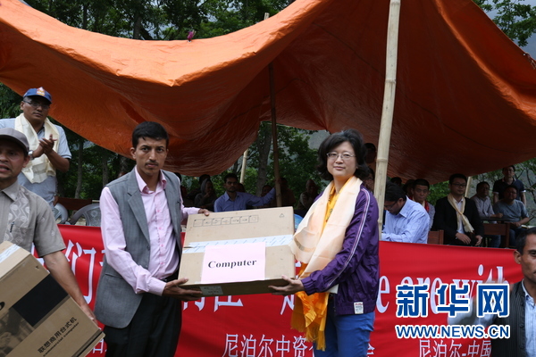 中国驻尼泊尔大使于红(右)给学校赠送电脑。此次,中国驻尼使馆一共赠送两台电脑、118台收音机。新华网发