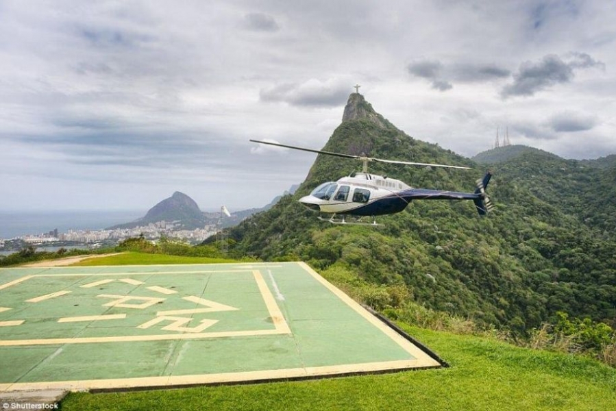 图为巴西里约热内卢科科瓦多山脚下的观光直升机停机坪。身后就是著名的基督雕像。