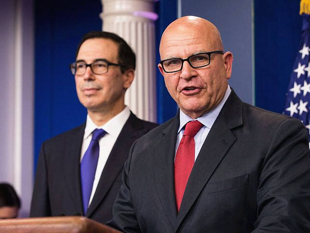 7月31日,美国总统国家安全事务助理麦克马斯特(右)和财政部长姆努钦出席白宫新闻会。(新华社发)