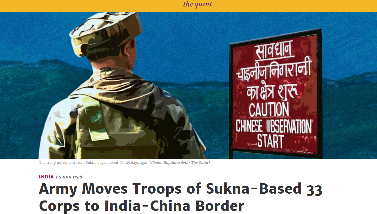 报道援引印军消息人士的话称,印军常驻苏克纳的第33军下属的3个师早在20-25天前就已经开始这次向中印边境部署的行动,部队最重要的部分已经进入指定“行动区域”。