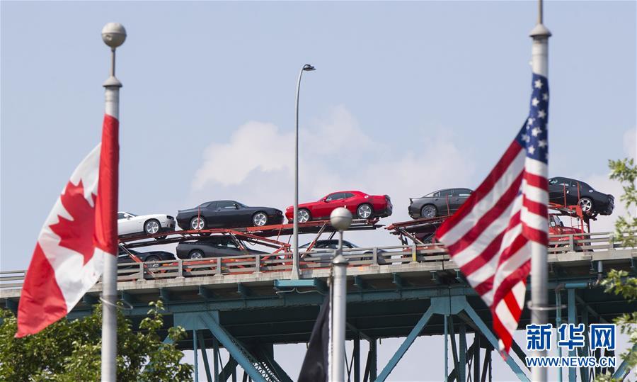 8月16日,在加拿大安大略省温莎市,一辆汽车运输车通过大使桥开往美国。