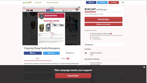 从当地时间8月3日起,在众筹网站GoFundMe上,章莹颖基金的募款目标已经从1.5万元美元提高到50万美元。截至记者发稿前,官方在GoFundMe设立的捐款账号已经募集到了14.5万美元。但是,在这个筹款页面上,有不少人捐款的同时,也有人留言对筹款上限一再提高表示了质疑,怀疑这笔捐款真正的用途。