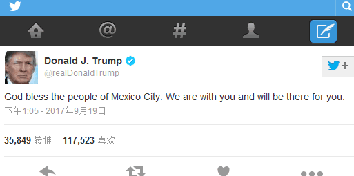 【环球网综合报道】墨西哥19日发生7.1级地震后,刚刚在联合国大会发表演讲的美国总统特朗普在推特上表示慰问。他写道,“上帝保佑墨西哥城人民,我们与你们同在,并且会一直支持你们。”