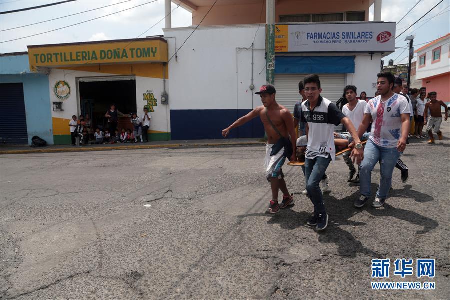 9月19日,在墨西哥莫雷洛斯州库埃纳瓦卡市,人们救助一名地震伤员。新华社发(马尔加里托·佩雷斯摄)