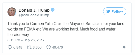 在首次评论玛利亚飓风在美国登陆之后造成的破坏时。他感谢圣胡安市市长卡门?尤琳?克鲁兹,并表示我们正在努力工作,有许多食物和水在路上。