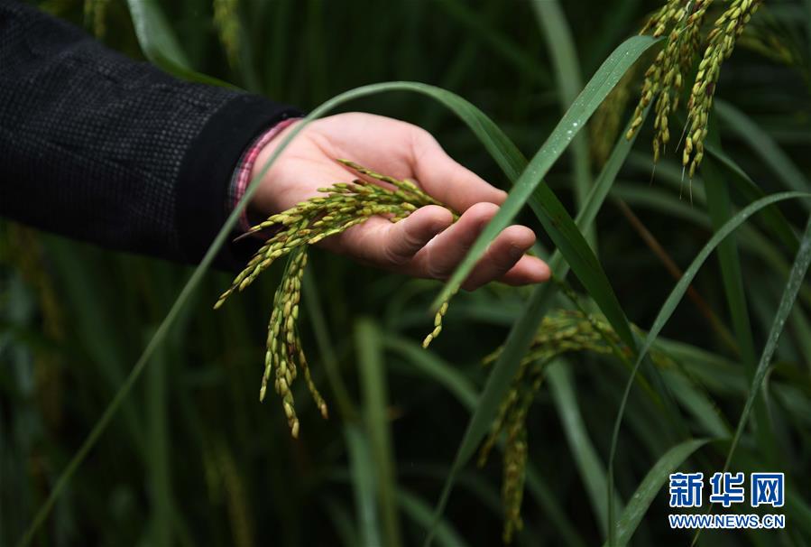 10月16日,在位于湖南长沙县金井镇的“巨型稻”试验田,工作人员查看“巨型稻”的稻穗。水稻长得比人高、亩产可达800千克以上--中国科学院亚热带农业生态研究所10月16日正式发布一种水稻新种质,株高可达2.2米,具有高产、抗倒伏、抗病虫害、耐淹涝等特点,被认为开启了水稻研制的一扇新门。新华社记者李尕摄