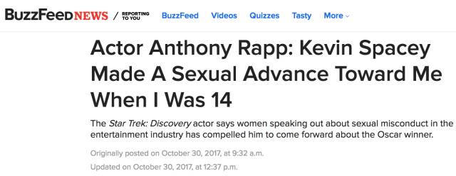 继好莱坞金牌制作人哈维·韦恩斯坦被揭发性侵几十位女演员之后,今天,美国又爆出一则性骚扰案:46岁的《星际迷航:发现号》男演员安东尼·拉普指控称,他14岁时曾被现年58岁的《纸牌屋》男主“木下总统”凯文·史派西性骚扰!