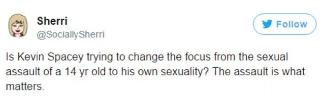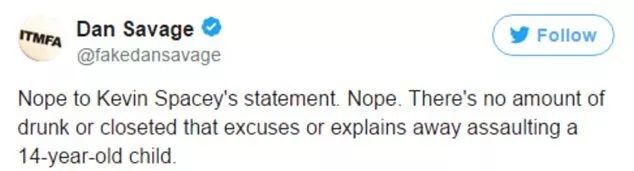 一位叫Dan Savage的记者也发推文表示,不接受凯文·史派西的声明。不接受。即使喝再多的酒也不能成为性骚扰14岁孩子的借口。
