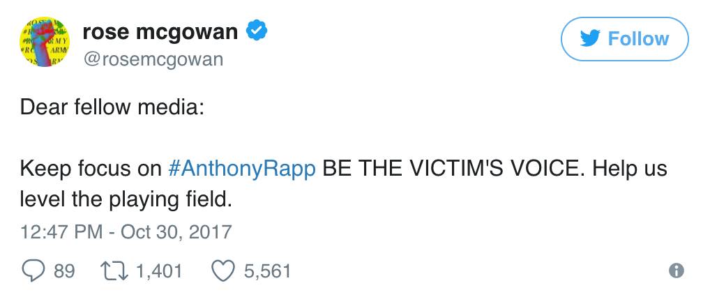 被哈维·韦恩斯坦性侵的美国女星罗丝·麦高恩也发推文称“亲爱媒体们,让我们继续把目光集中在发出受害者声音的拉普身上,请帮我们建立一个公平的环境”。