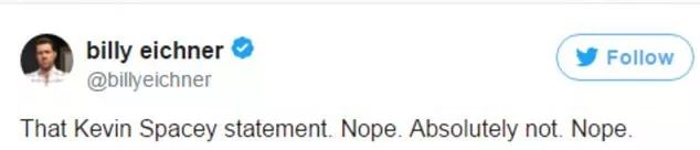 美国喜剧男星Billy Eichner也愤怒发推文:不接受凯文·史派西的声明。绝对拒绝。