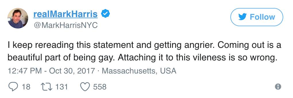 美国作家Mark Harris:我越读这则声明就越生气。出柜是作为同性恋的一个美丽的部分。但把出柜和这件卑劣的事情联系在一起就很糟糕。
