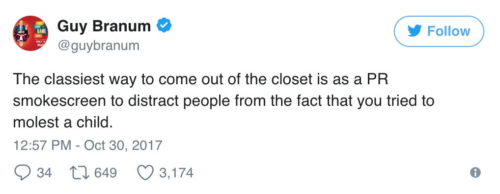 美国喜剧作家Guy Branum:最经典的出柜方式就是作为一个公关烟幕弹,来分散人们对你曾试图性骚扰一个孩子的注意力。