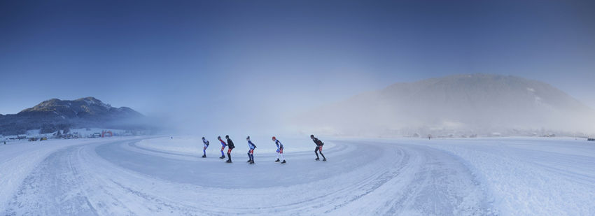 在冬季,奥地利的魏森湖一旦结冰,速度滑冰者们就会到冰上去练习。