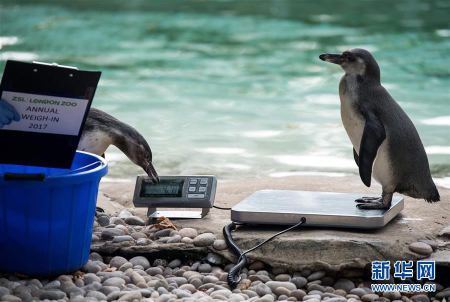 这是2017年8月24日,在英国伦敦动物园,一只企鹅在称体重,另一只在旁边“读数”。新华社/法新