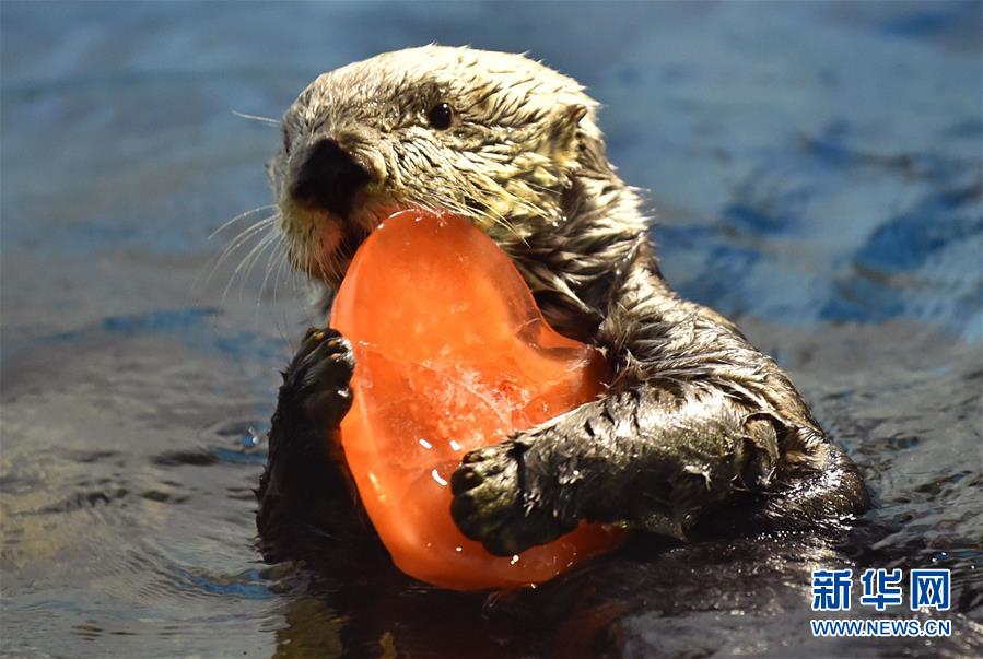 这是2017年2月11日,在日本横滨的八景岛海洋乐园,一只海獭抱着一块心形的冰块。新华社/法新