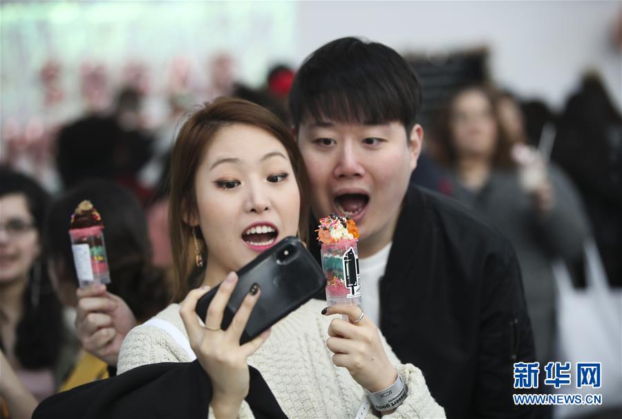 3月18日,在美国纽约,人们在甜品节上手持甜品自拍。一年一度的纽约“甜品目标”甜品节于17日开幕,20多家甜品展商在现场展示造型精美、创意十足的美味甜品,吸引超过5000名甜品爱好者报名参加。甜品节还精心设置了美拍专区,方便人们在享用甜品的同时在社交平台上分享甜蜜时刻。新华社记者王迎摄