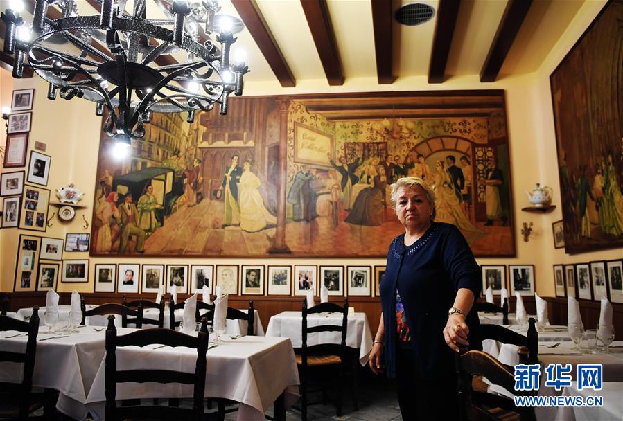 4月6日,在西班牙巴塞罗那,餐馆的经营者阿古特夫人站在古耶雷特斯餐馆内。从西班牙巴塞罗那市中心出发,沿繁华的兰布拉斯步行街走上几百米,拐进一条不起眼的小巷,就会看到一栋老建筑的门口挂着一块仿佛来自老电影的雕花招牌——“古耶雷特斯之家,1786”。这就是古耶雷特斯餐馆,巴塞罗那历史最悠久的餐馆。新华社记者郭求达摄