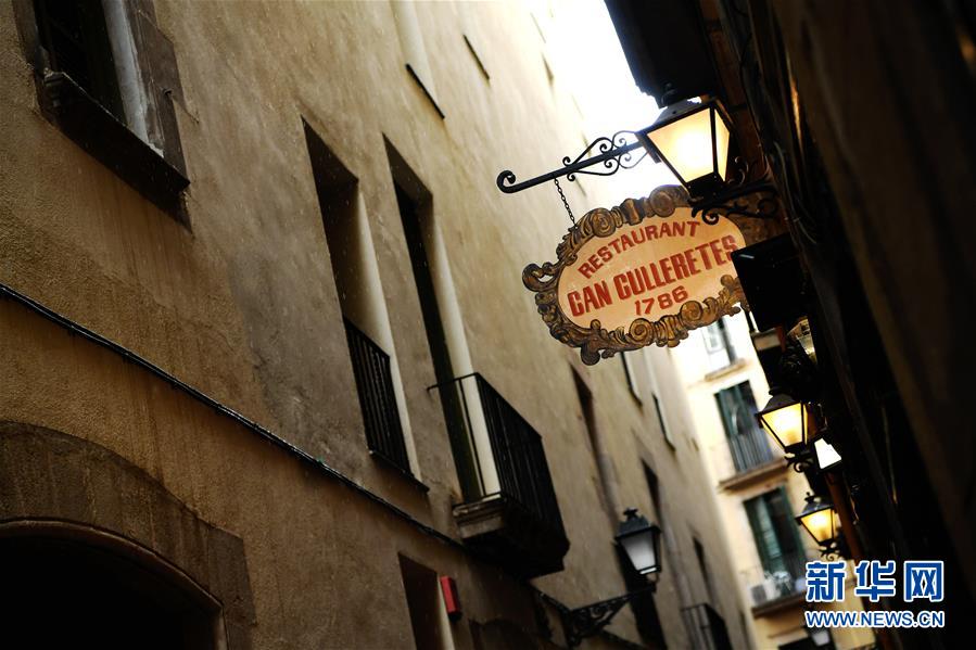 这是4月6日在西班牙巴塞罗那拍摄的古耶雷特斯餐馆的雕花招牌。从西班牙巴塞罗那市中心出发,沿繁华的兰布拉斯步行街走上几百米,拐进一条不起眼的小巷,就会看到一栋老建筑的门口挂着一块仿佛来自老电影的雕花招牌——“古耶雷特斯之家,1786”。这就是古耶雷特斯餐馆,巴塞罗那历史最悠久的餐馆。新华社记者郭求达摄