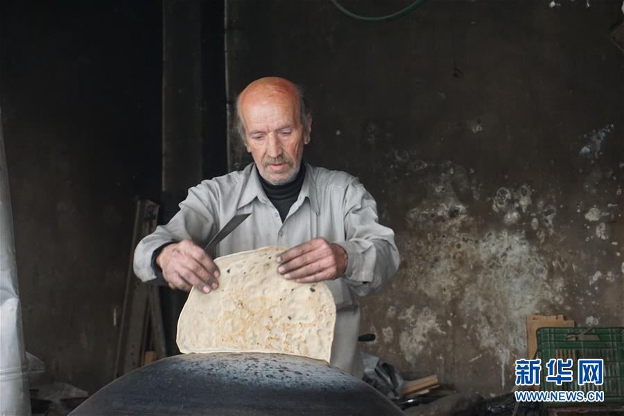 4月16日,在叙利亚大马士革东郊杜马镇,一名小贩在路边烹制大饼。新华社发(徐德智摄)