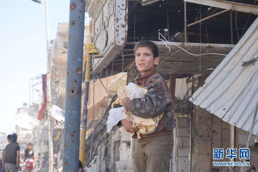 4月16日,在叙利亚大马士革东郊杜马镇,一名儿童在街边领取大饼。新华社发(徐德智摄)