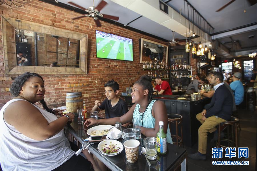 6月14日,人们在美国纽约曼哈顿下城的一家酒吧观看球赛直播。当日,第21届世界杯足球赛在俄罗斯首都莫斯科开幕。为抓住世界杯商机,纽约不少酒吧和餐厅在店内外增添了世界杯相关装饰,设置大屏幕直播球赛,并延长了白天的营业时间以迎合球迷看球的需求。新华社记者王迎摄