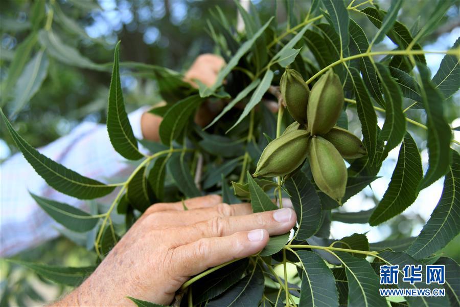 7月10日,在美国佐治亚州奥西拉,山核桃种植户兰迪·哈德逊在自己的种植园中展示未成熟的山核桃。作为对美国贸易保护主义行径的反击,中国被迫对包括山核桃在内的部分美国商品加征关税。哈德逊说,美国的贸易保护主义举措让他感到忧心和愤怒,他担心自己过去20年的心血可能毁于一旦。新华社记者杨承霖摄