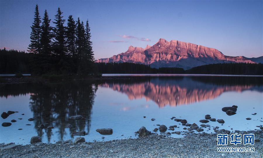 这是在加拿大落基山脉班夫国家公园拍摄的日出时分的双杰克湖与朗德尔山(7月19日摄)。加拿大落基山脉是北美洲落基山脉在加拿大境内的总称,主要位于西部不列颠哥伦比亚省与艾伯塔省,分布着班夫、贾斯珀、约霍与库特内等多个国家公园。这里不仅野生动物众多,更有气象万千、色彩缤纷的奇山、大湖、飞瀑、冰川,吸引着来自世界各地的游客。新华社发(邹峥摄)