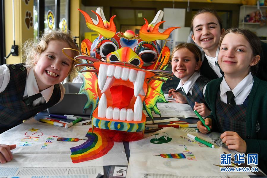 9月12日,在新西兰首都惠灵顿的马斯登女校,孩子们与中国传统龙形风筝合影。