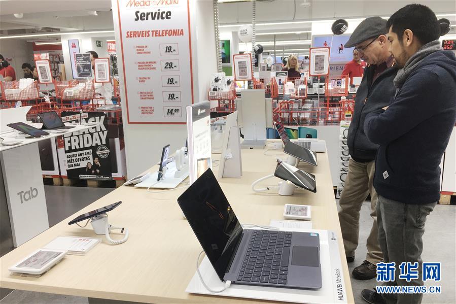 11月25日,顾客在西班牙巴塞罗那的一家电子用品商场选购华为智能电子产品。新华社记者郑焕松摄