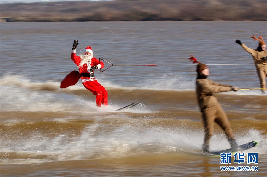 12月24日,在美国弗吉尼亚州亚历山德里亚的波托马克河上,人们装扮成圣诞老人和驯鹿参加滑水表演。