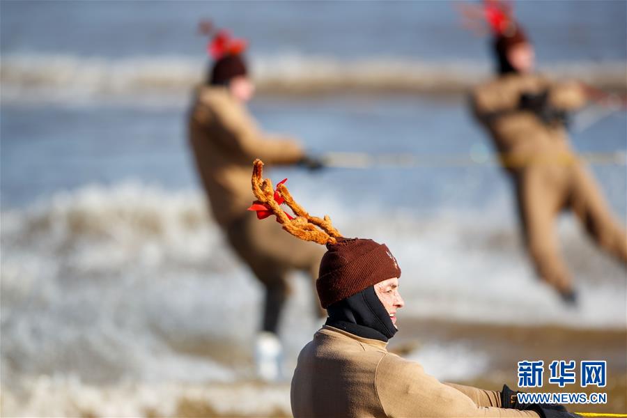 12月24日,在美国弗吉尼亚州亚历山德里亚的波托马克河上,人们装扮成驯鹿参加滑水表演。新华社发(沈霆摄)