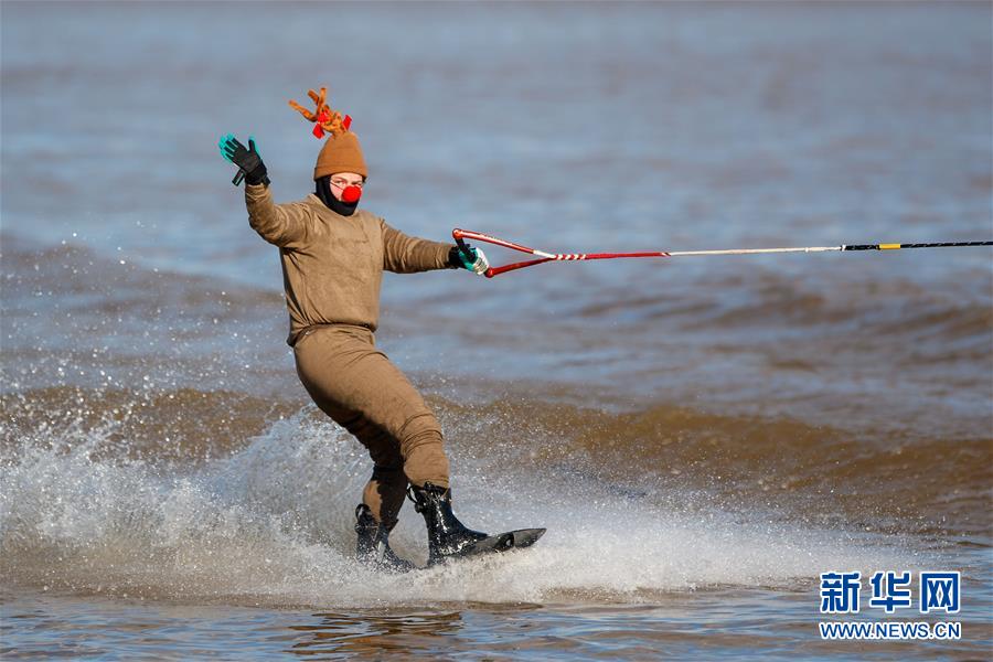 12月24日,在美国弗吉尼亚州亚历山德里亚的波托马克河上,一名表演者装扮成驯鹿进行滑水表演。新华社发(沈霆摄)