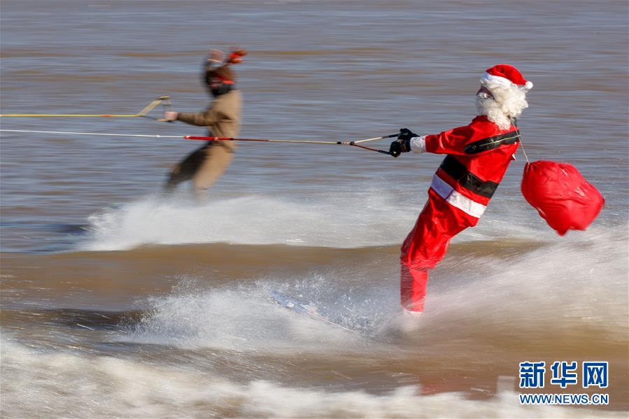 12月24日,在美国弗吉尼亚州亚历山德里亚的波托马克河上,人们装扮成圣诞老人和驯鹿参加滑水表演。新华社发(沈霆摄)
