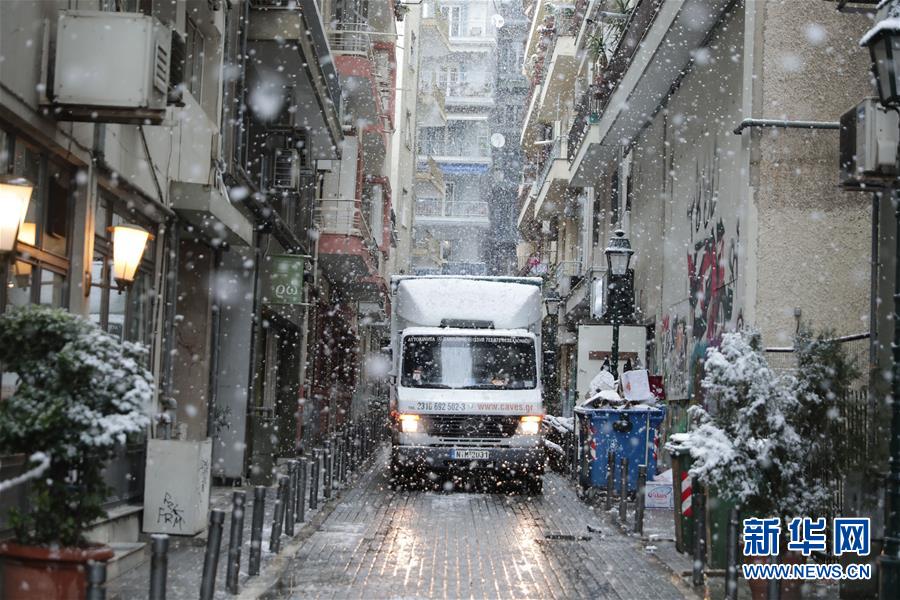 1月4日,在希腊塞萨洛尼基,一辆货车从飘雪的小巷驶过。希腊消防部门6日表示,寒流带来的恶劣天气在希腊已造成3人死亡。新年伊始,寒流给希腊全国大部地区带来大风、降温和雨雪天气,中部和北部地区气温降至零度以下并出现强降雪天气,造成部分地区道路封闭、大面积航班延误及轮渡停运。新华社发(莱夫特里斯·帕察里斯摄)