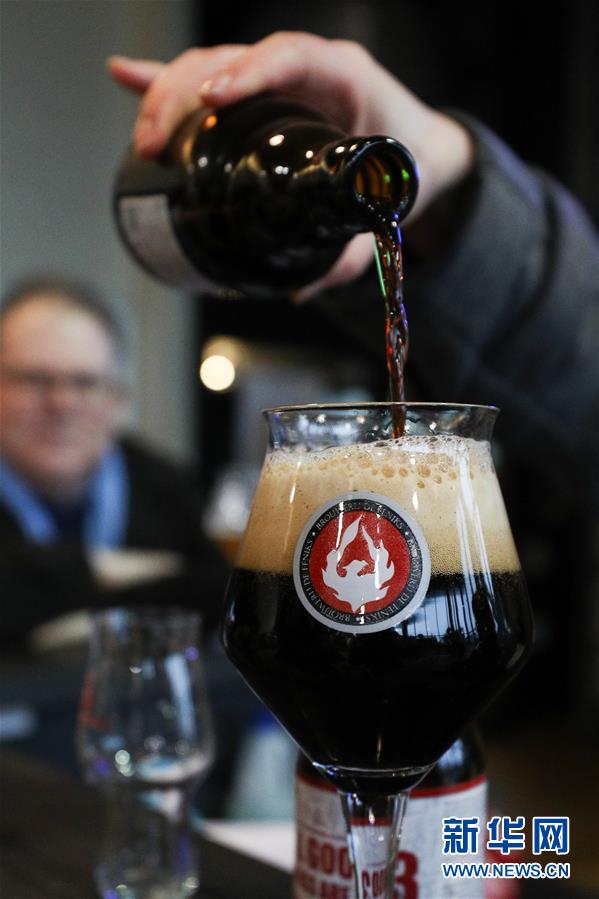 2月6日,在比利时弗兰德斯大区科特赖克,王敏展示她的酿酒厂生产的啤酒。新华社记者郑焕松摄