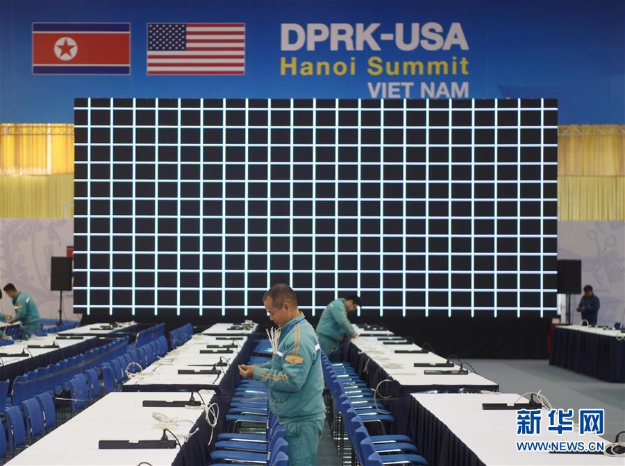 2月25日,在越南首都河内,技术人员在朝美领导人第二次会晤国际媒体中心工作。朝鲜最高领导人金正恩与美国总统特朗普27日至28日将在越南首都河内举行第二次会晤,磋商如何进一步推动半岛无核化进程以及改善朝美关系。新华社发(王申摄)