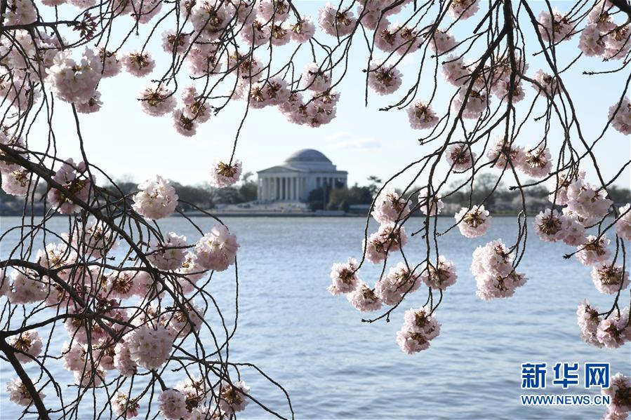 这是4月1日在美国首都华盛顿的潮汐湖畔拍摄的樱花和杰斐逊纪念堂。近日,华盛顿潮汐湖畔数千株樱花盛开,吸引众多游客前来观赏。新华社记者刘杰摄
