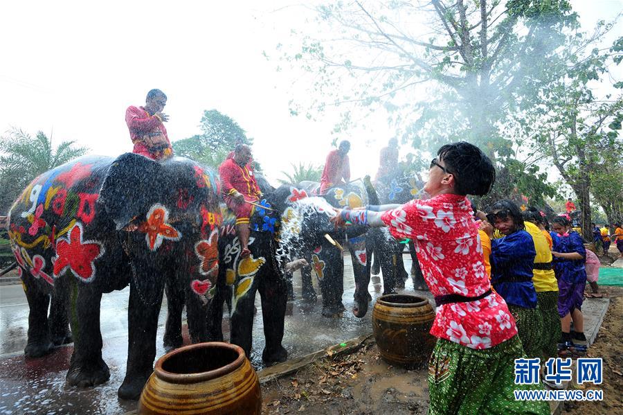 4月11日,在泰国大城府举行的庆祝活动上,一名游客向大象泼水。当日,泰国古都大城府举行庆祝活动,迎接即将到来的泰历新年“宋干节”。新华社发(拉亨摄)