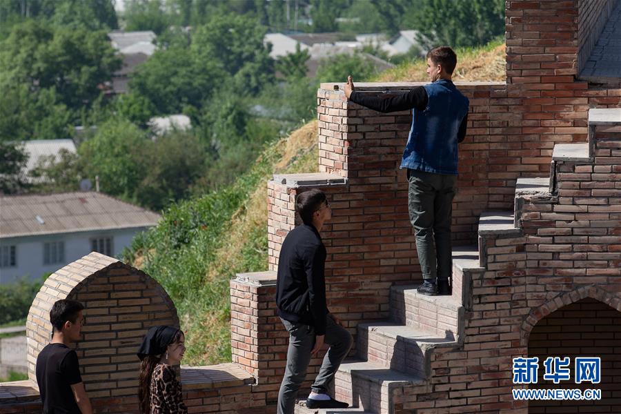 4月14日,在塔吉克斯坦首都杜尚别以西的吉萨尔城堡,一名游客自拍。新华社记者白雪骐摄